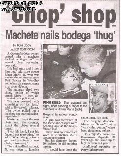 Un comerciante dominicano de 45 años se enfrentó a un maleante armado quien le disparó dos veces y no pegó pero el criollo le sacó un machete y se le fue encima mandándolo al hospital ensangrentado y con un dedo menos. Yo siempre he dicho que en en este país está Dios (uno se puede hacer rico y famoso) y también está el diablo ( puede encontrarse una trajedia, la muerte en cualquier lado).